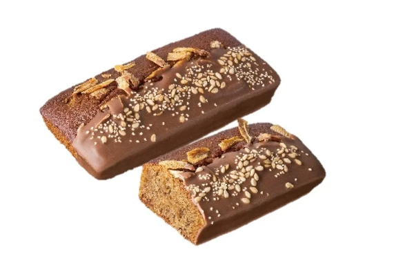 国産ごぼうパウダーを使用したフィナンシェは香ばしく…トップにはごぼうのささがきがのせられ、さっくり焼き上げられています。ほんのりキャラメル風味のミルクチョコレートを半分 コーティングされた美しいビジュアル。白煎り胡麻とケシの実をトッピングでアクセント。