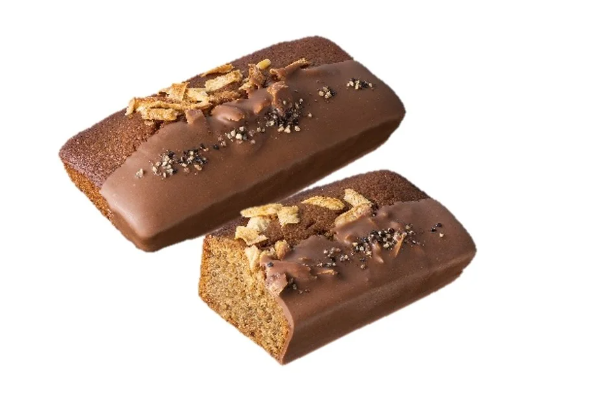 国産ごぼうパウダー使用したフィナンシェは香ばしく、ごぼうのささがきがアクセントと個性を出しています。ほんのりキャラメル風味ミルクチョコレートが半分 コーティングされ、黒胡椒&ゲランドの塩トッピング。黒コショウのアクセントが効いた大人の味。