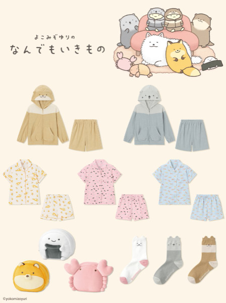 GU(ジーユー)から「なんでもいきもの(なんもの)」コラボアイテムが発売!サンエックス株式会社在籍中にすみっコぐらし原案を手がけたキャラクターデザイナー「よこみぞゆり」さんが描くキャラクター「なんでもいきもの」たちがグッズやアパレルになって登場です。ころんと可愛いのりおにぎり、かに、だめぎつねのポーチバッグや、カニとえびの総柄パジャマ、ラッコとカワウソのパーカー上下セット等癒し系アイテムに大注目♪