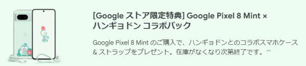 | キャンペーン概要 | 「Google Pixel 8 Mint」とハンギョドンがコラボ!Google Pixel 8 Mintを購入で、スマホケース&ストラップコラボパックがもらえる |