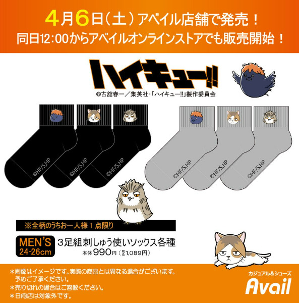 4月6日から、全国のアベイル店舗で「ハイキュー!」とのコラボ商品が発売されます!だるまマスコットとぬいぐるみマスコット、3足組の刺しゅうが入ったソックスです♪どれも可愛く、全部揃えたくなってしまいます!それぞれ、購入制限がありますので、購入の際は注意してください!
