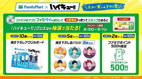 ファミリーマートに、ハイキュー!!が帰ってきた🏐✨描き下ろしビジュアルを使用した限定グッズや豪華プレゼントがもらえるコラボキャンペーンが2025年8月5日(火)からスタート🎁全国のファミマ店舗で、ここでしか手に入らない日向・影山・及川たちのグッズをゲットしよう!