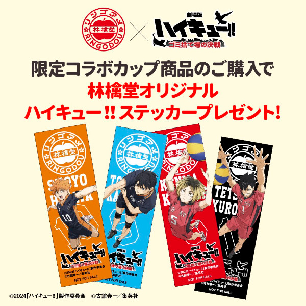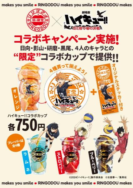 林檎堂×ハイキュー!ステッカーもらえるコラボカップ商品販売♪日向・影山・研磨・黒尾4人のカラーイメージフレーバー展開