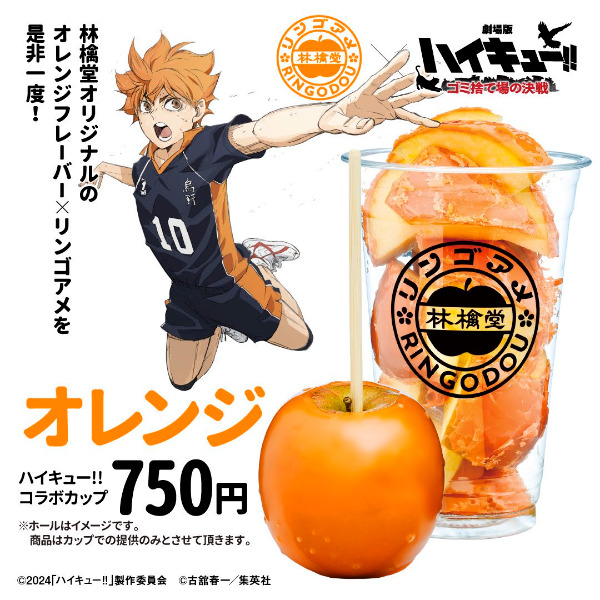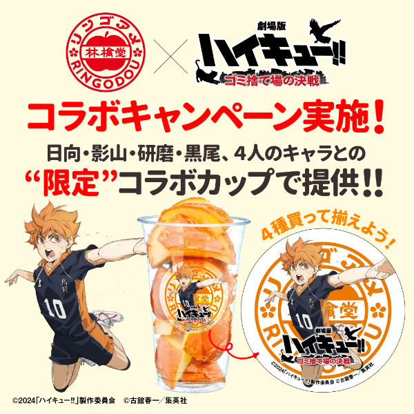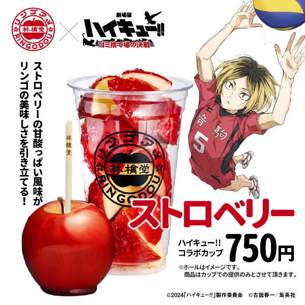 りんご飴専門店「林檎堂」と「劇場版ハイキュー!!ゴミ捨て場の決戦」のコラボが決定しました!日向・影山・研磨・黒尾をイメージした林檎堂の人気フレーバー4種類がコラボカップで登場!さらに購入したコラボカップと同じキャラクターのオリジナルステッカーもプレゼント!数量限定、コラボカップが無くなり次第終了なのでお早めに♡