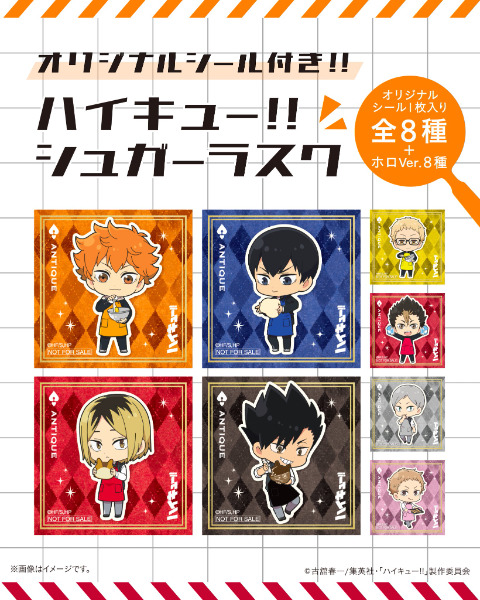 「ハイキュー!!」の推しが…シュガーラスクになってやってきたーっ🎉✨影山や日向、研磨や黒尾など8人のキャラがシールに♪ホロver.もあって、どれが出るかドキドキが止まらない〜!ラスクの甘さとハイキュー愛が同時に味わえる、最高のコラボだよっ!