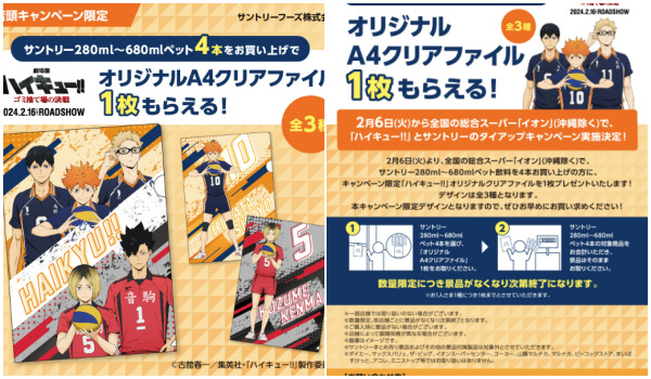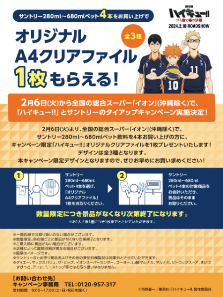 2024年2月6日から、全国のイオン(沖縄を除く)で、対象のサントリー商品を買うと「ハイキュー!!」のオリジナルクリアファイルがもらえちゃいます♪映画のオリジナルデザインです♡種類は全部で3種類!ぜひ店頭に足を運んでみて下さい!