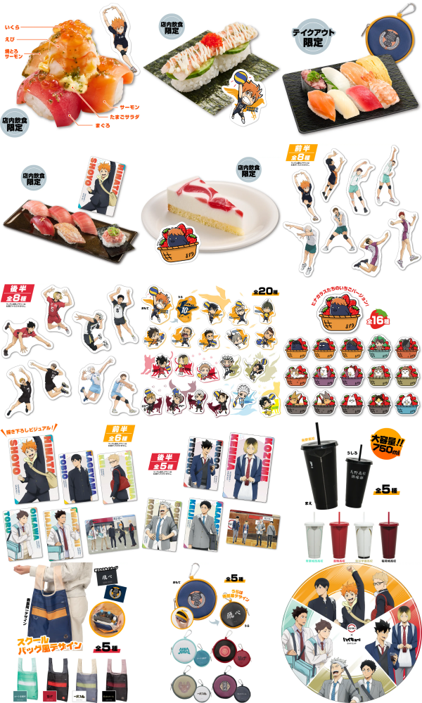 スシロー×『ハイキュー!!』の2回目のコラボ情報解禁!ピックやステッカー・カード付き商品やドリンクカップ付き ソフトドリンク、ポーチ付き お持ち帰りセットなど盛りだくさんの内容!お寿司を楽しみながら、ハイキュー愛を深める最高のチャンス♪Q.グッズはどこで売ってる? A.全国のスシロー店舗(一部除く)Q.いつからいつまで? A.2025年3月5日~3月30日