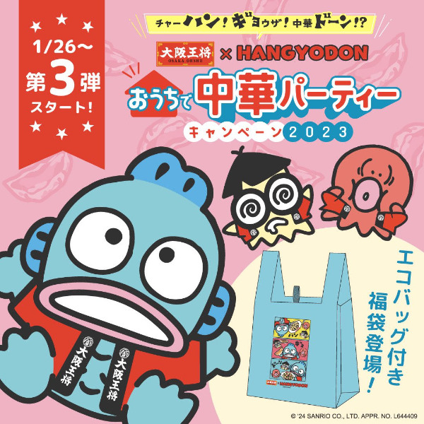 ハンギョドン×大阪王将コラボキャンペーン! 通販限定コラボ福袋の第3弾が発売されました。販売期間は2024年1月26日(金)〜2024年2月29日(木)で、直火炒めチャーハンやジャンボニラ餃子など大阪王将の人気中華総菜とハンギョドンのオリジナルデザインのエコバッグがセットになっています。数量限定、無くなり次第終了なのでお早めに♪