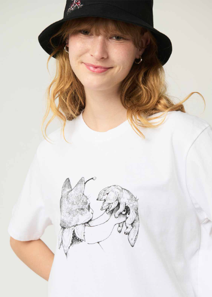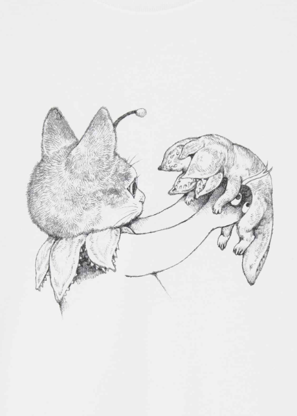 ストレンジャーシングスをテーマに、画家ヒグチユウコが描いた特別なデザインTシャツが登場。ヒグチユウコの象徴的なキャラクターであるギュスターヴくんが、ダートを抱っこしている姿は絶妙に愛らしく、繊細な線描が毛並みや質感が表現されています。ギュスターヴくんの襟元にも注目してみてください。