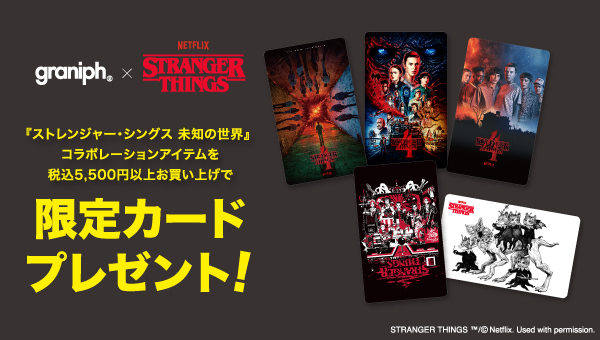 グラニフ国内店舗とグラニフ公式オンラインストアにて『ストレンジャー・シングス 未知の世界』コラボアイテムを税込5,500円以上購入の方に、先着でオリジナルデザインの限定カードがプレゼントされます。どれか1枚ランダム配布となっています。