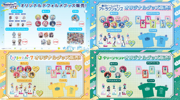 「hololive CITY’24」各会場では、ホロライブプロダクション所属の女性タレント63人がキービジュアルに描かれたデフォルメイラストを使用したオリジナルグッズが登場します。クリアカード、缶バッジ、うちわ、ミニアクリルスタンドセット、クリアファイルセット、アクリルパネルがラインナップ♪