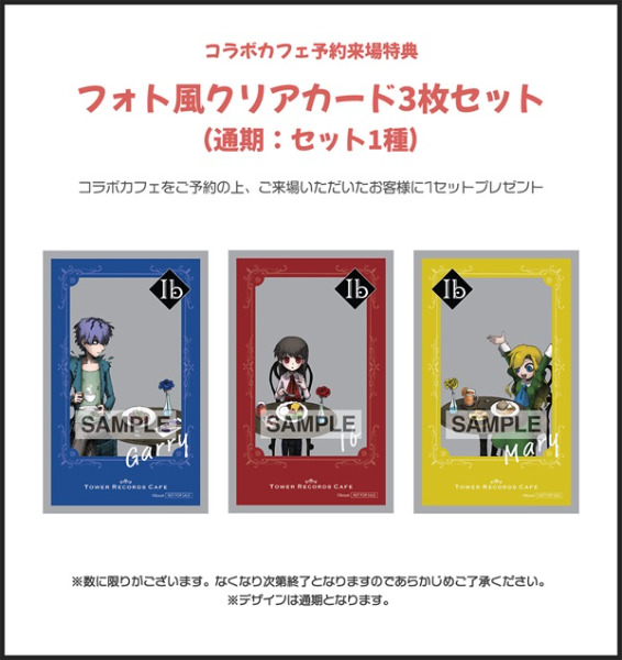『Ib』 × TOWER RECORDS CAFEコラボが決定しました!2024年3月1日より、タワーレコードカフェの東京表参道店と大阪ステーションシティ店にて、コラボカフェが開催されます。グッズはイヴ・ギャリー・メアリーの描き下ろしイラストを使用したアクリルキーホルダーやキャンバスボード、スマキャラスタンドなどをラインナップ!予約制となっており、予約特典としてフォト風クリアカード3枚セットをプレゼント!さらにコラボメニュー・テイクアウトメニュー注文1点ごとにランダムでポストカードを1枚、飲食・物販購入5,000円ごとに美術館入場チケット風ステッカー3枚セットプレゼントなど盛りだくさんの内容となっています♪