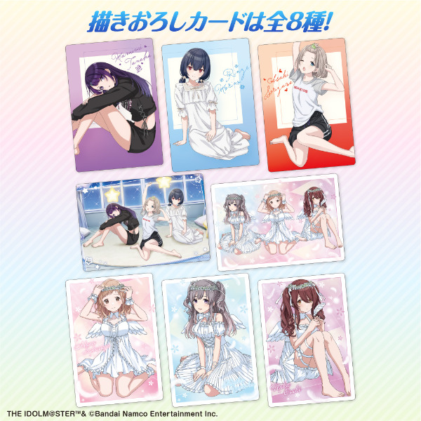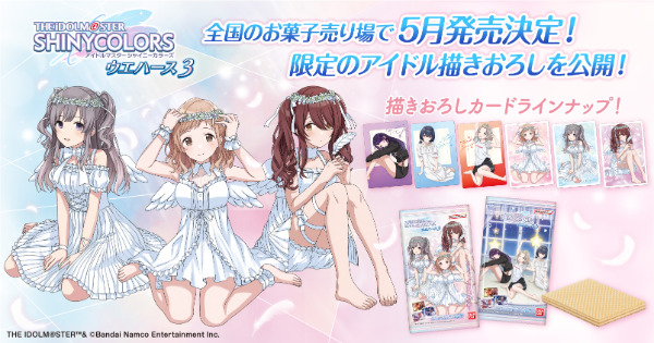 「アイドルマスター シャイニーカラーズ」の描き下ろしイラストを使用したカード付ウエハース第3弾の予約が始まりました!ふわふわな天使をイメージしたオリジナル衣装と「プライベートドレスダウン」のパジャマ姿の描き下ろしイラストを収録!全国量販店の菓子売場等にて2024年5月より取扱い開始。カードはアイドルカード28種、ユニットカード8種、描きおろしカード8種の全44種で、高級感のあるメタリックプラカード!ユニットカードは豪華なホロ箔押し仕様♪