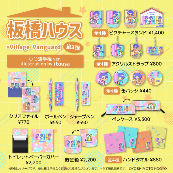 板橋ハウスの「ヴィレッジヴァンガード」コラボグッズ第3弾!大人気動画シリーズ「○○選手権」・「コンビニ企画」・「全ての答えを持つ男」をテーマにした描き下ろしイラストグッズが多数登場します。トイレットペーパーカバーや「板橋ハウス」の記念日が記載された特別仕様のポスターカレンダー、トートバッグなどをラインナップ。現時点ではオンラインストアのみ取扱い、店頭販売は未定なので確実に手に入れるなら期間中にオンラインストアでの購入がおすすめ♡