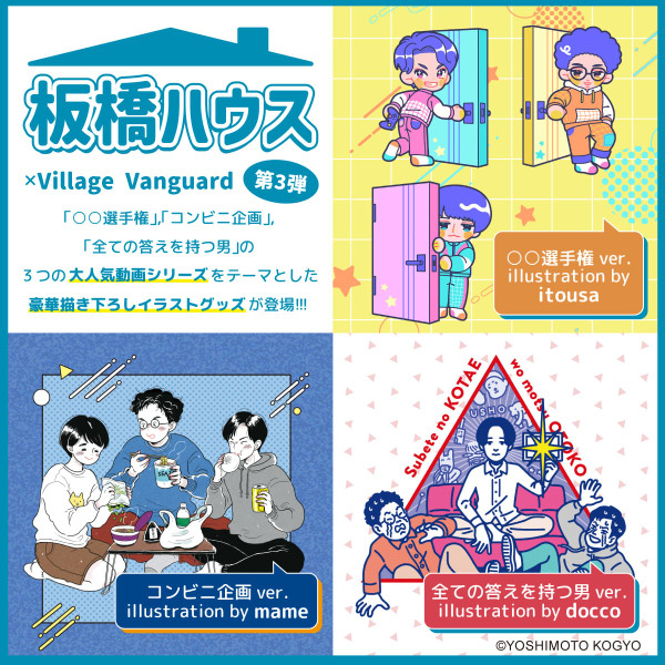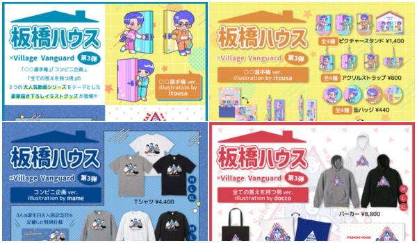 板橋ハウス「ヴィレッジヴァンガード」コラボグッズ第3弾登場!ピクチャースタンドやTシャツ、パーカーなど、大人気動画「○○選手権」・「コンビニ企画」・「全ての答えを持つ男」をテーマにしたグッズをラインナップ!それぞれ別のイラストレーターさんの描き下ろしイラストでそれぞれのテーマにぴったり♪