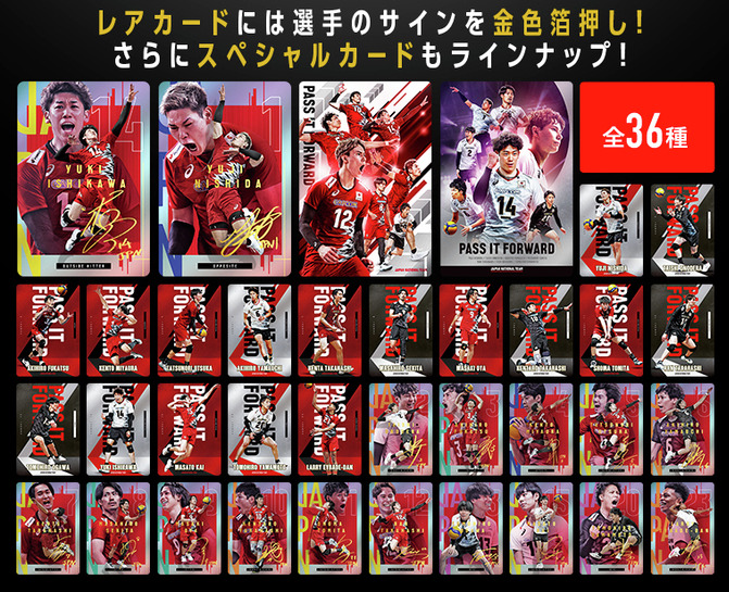 バレーボール男子日本代表の熱意溢れるプレイ写真が全36種類のカードになって登場✨ レアカードには選手のサインを金色箔押し!スペシャルカードもラインナップ。17名の選手のアートカードをゲットしよう!