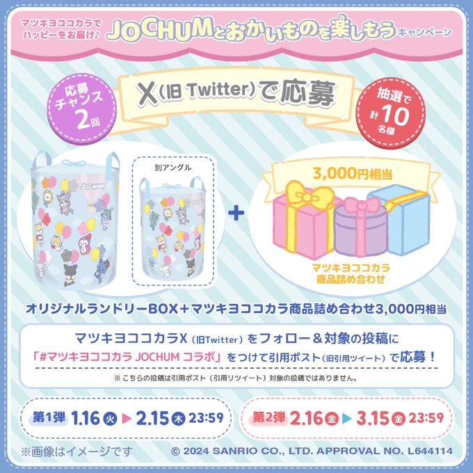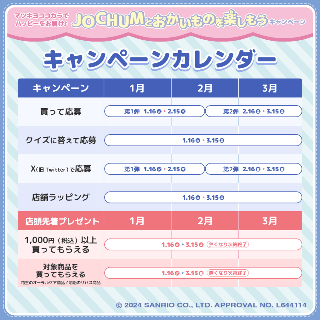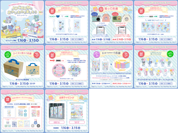 2024年1月16日から、JOCHUM(ジェオチャム)とマツキヨココカラのコラボキャンペーンが開催されます。プレゼント抽選応募や買ってもらえるキャンペーンのほか、ジェオチャム限定グッズの販売、店舗装飾など楽しい企画が盛りだくさん♥歯ブラシスタンドや、コースター、救急箱、トイカメラ等、今回のコラボ限定アイテムをお見逃しなく!キャンペーンの実施予定は要チェックです。