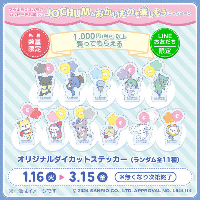 | JOCHUM のオリジナルダイカットステッカー(ランダム全11種)を先着順で1枚プレゼント! 【引換方法】 ①マツキヨココカラ公式LINEをお友だち追加 ②税込1,000円以上のお買物 ③LINEリッチメニューから引換画面を提示 |