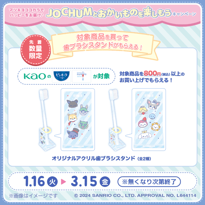 | 花王 ピュオーラを買ってもらえる! 対象商品を税込800円以上購入&キャンペーンサイトの引換画面提示で [JOCHUM アクリル歯ブラシスタンド(ランダム全2種)]が先着で1点もらえる! 期間:1/16(火)~3/15(金) ※無くなり次第終了 |