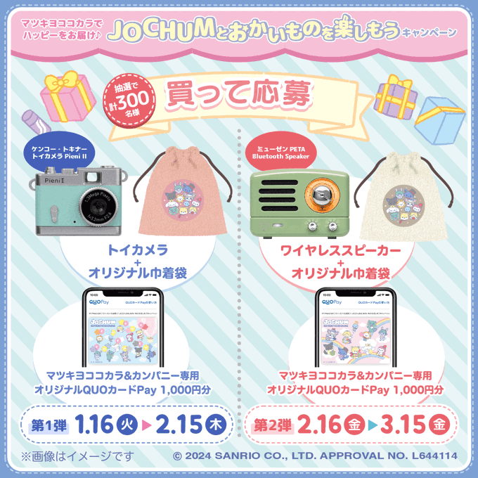ジェオチャムの巾着付き豪華グッズが当たる♪第1弾はトイカメラ、第2弾はワイヤレススピーカー♪
