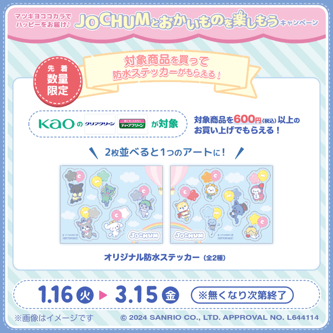 | 花王 クリアクリーン、ディープクリーンを買ってもらえる!対象商品を税込600円以上購入&キャンペーンサイトの引換画面提示で JOCHUM 防水ステッカー(ランダム全2種)が先着で1枚もらえる! 期間:1/16(火)~3/15(金) ※無くなり次第終了 |