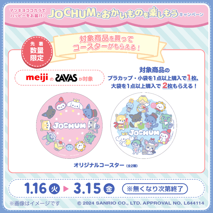 | 明治「ザバス」を買ってもらえる!対象商品を1点以上お買い上げ&キャンペーンサイトの引換画面提示で JOCHUM コースター(ランダム全2種)が先着順で1枚もしくは2枚もらえる 期間:1/16(火)~3/15(金) ※無くなり次第終了 |
