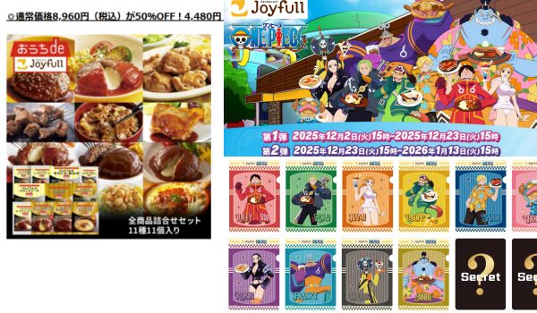 これは見逃せないコラボレーション!🎉 ファミリーレストランのジョイフルと超人気アニメ『ワンピース』の夢のタッグが実現です!🥳 冷凍おうちdeジョイフル「お楽しみセット」福袋が、なんと半額(50%OFF)クーポン付きでオンライン通販に登場!さらに、先着2,000名様限定で、ここでしか手に入らないオリジナルクリアファイルがプレゼントされますよ!💨 豪華すぎるセットとグッズを見逃すな!