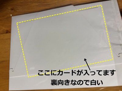 シアター入口で頂いたのは特典がセットになったパックです。カードは一見すると見えないのですが、アートスタンドの裏側に裏向きに封入されています。これは6種類のカードがランダム封入なので、外から見えないようにするためですね。開封のワクワク感があります!でもグッズ開けない派の人はここにカードがあるの気づかないかもしれませんね。要チェックです😳