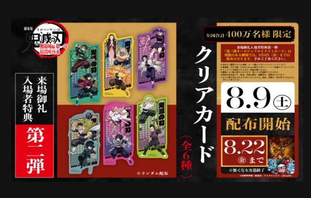 劇場版「鬼滅の刃」無限城編 第一章 猗窩座再来では、8月9日(土)から8月22日(金)までの期間限定で、新たな入場者プレゼントを配布します。今回の特典は「クリアカード(全6種)」で、全国合計400万名様にお届け。ファン必携のコレクションアイテムを、この機会にぜひ手に入れてください。