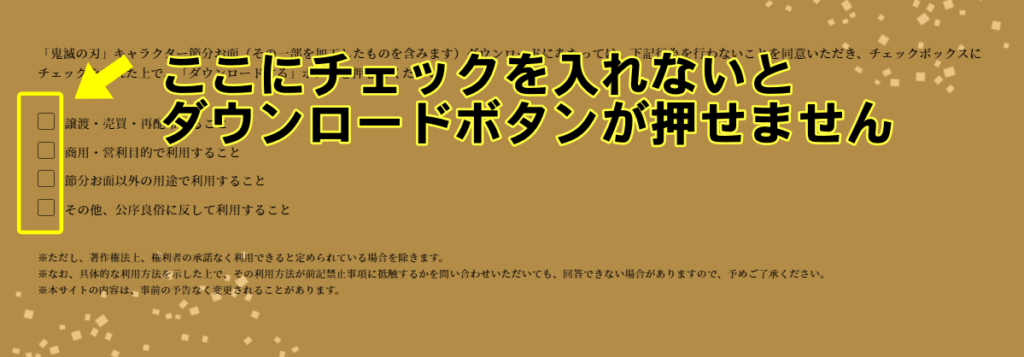 ❶鬼滅の刃お面イラストをダウンロードするには、同意項目へのチェックが必要です。