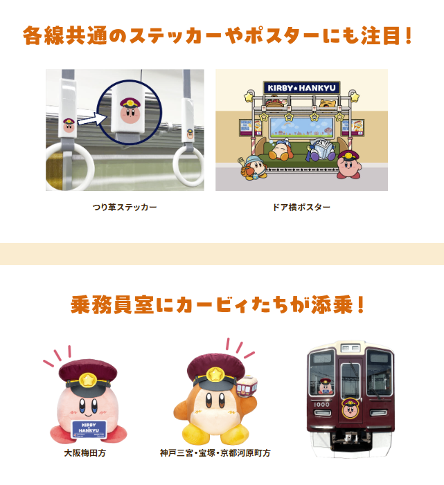 阪急電鉄とカービィのコラボとか最高すぎる…!神戸線・宝塚線・京都線それぞれ限定デザインって聞いた瞬間、全部制覇したくなった。添乗ぬいぐるみのカービィとワドルディが並んでるのも癒されすぎて、写真スポットとして絶対人気になると思う。