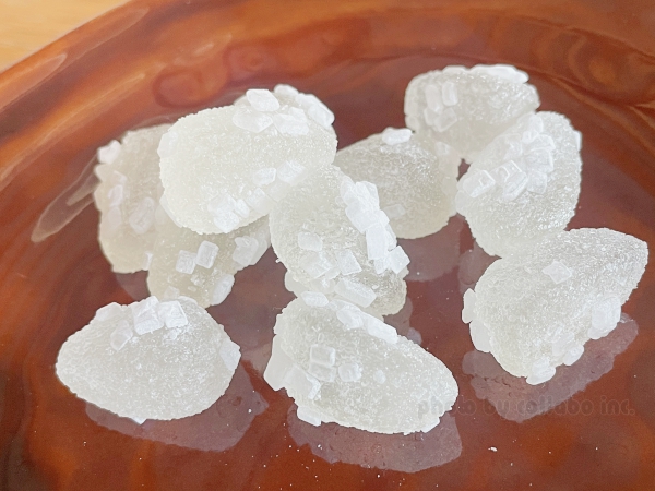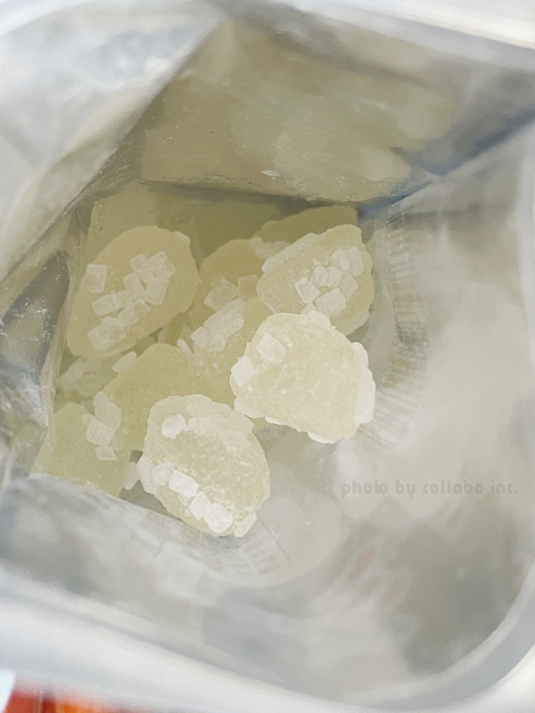 グミの周りには氷の結晶に見立てた粒粒がついています。食べてみるとグミはしっかり歯ごたえに、結晶部分がシャリシャリと違った触感を与えてくれて食べて楽しい♪