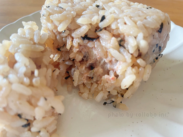 次はかにみそ醤油まぜめし。たらこマヨネーズいり。こちらはカニ味噌の甘味がいっぱいに広がるおにぎりで幸せな気持ちになれるメニューですね。おにぎりは1つでおかずとごはんが味わえるので、こちらも迷ったら1つで満足度が高いのでおすすめです。