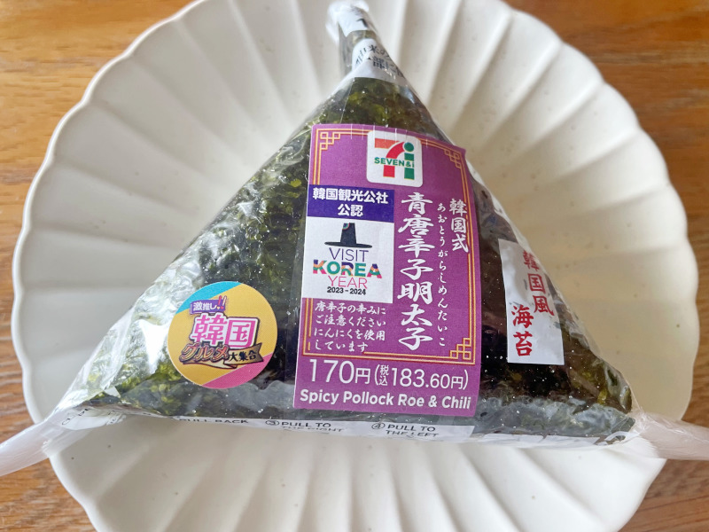 つぎは韓国式青唐辛子明太子おにぎり、しっかり辛味のある青唐辛子明太子が新鮮でおいしいです。しょっぱい韓国海苔ともぴったり合って美味です。
