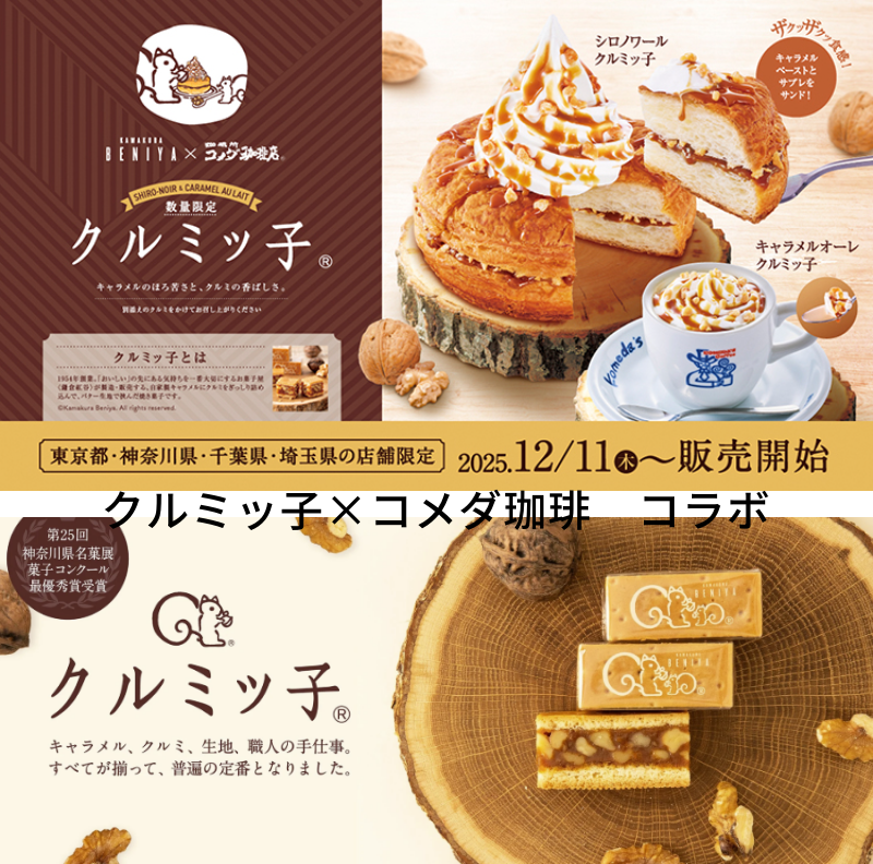 ・鎌倉紅谷のクルミッ子とコメダ珈琲店の関東4県限定コラボが実現。 ・シロノワール クルミッ子とキャラメルオーレ クルミッ子の2商品が登場。 ・12月11日(木)より販売開始され、2026年1月上旬頃までの予定。数量限定のためなくなり次第終了。