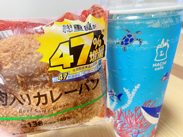 まずは牛肉入りカレーパンとアイスコーヒーを実食。