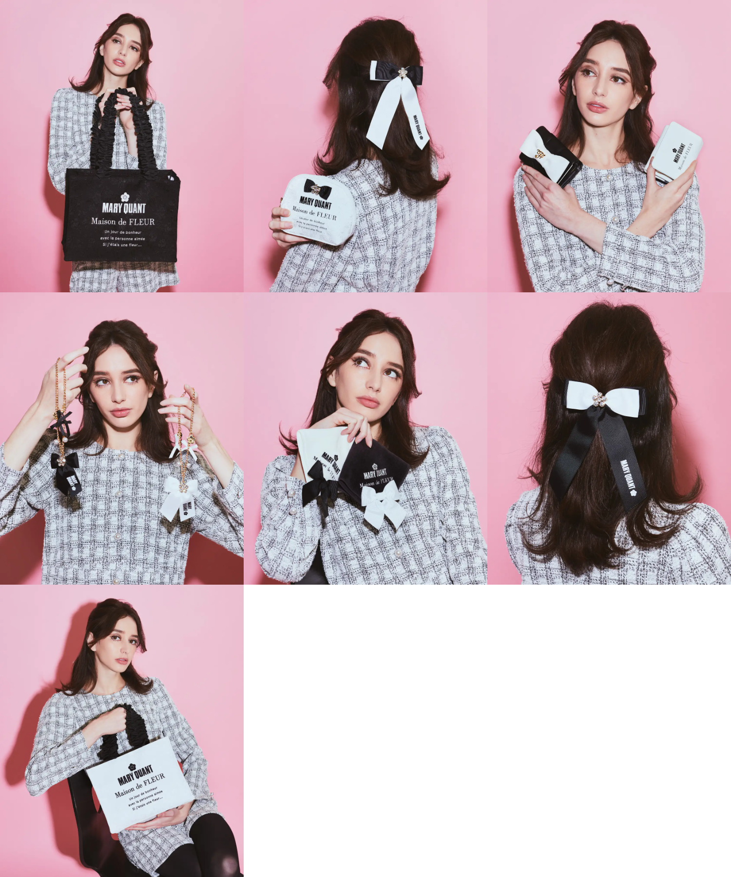 バッグに付けるチャームや大きなリボンのバレッタなど、日常使いしやすいアイテムが多くて嬉しいです。MARY QUANTの象徴的なデイジーモチーフとMaison de FLEURのフリルやリボンの組み合わせ、最高!