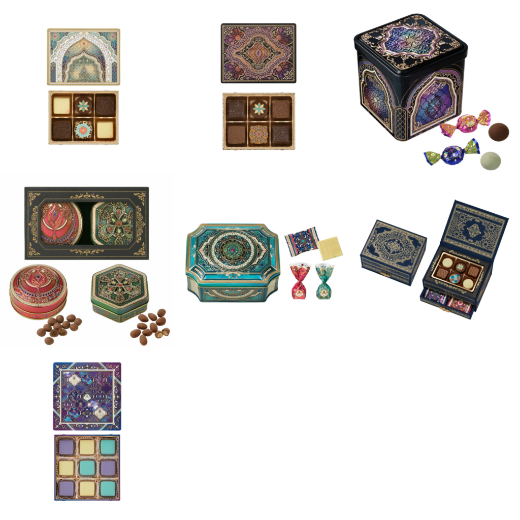 ラインナップには、美しい青をテーマにした「アズラクジャミール」、朝焼けや夜空を表現した「サバーフ」「ライル」、モザイクランプの光を思わせる「ダウイ」、情熱的な彩りが印象的な「イシュク」など、表情豊かな商品がそろいます。限定店舗向けの「ナビール」は、紅茶やナッツを贅沢に組み合わせた特別仕様。