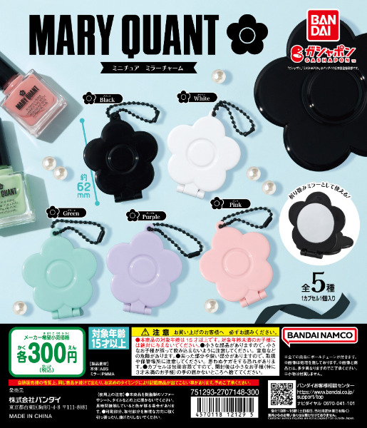 大人気コスメブランドMARY QUANT(マリクワ)がガシャポン初登場!ブランドシンボルであるデイジー形でミニチュアの鏡がチャームになりました♪カラーは定番の黒やガシャポンオリジナルカラーのピンク・パープルなど全5種が展開。折りたたみミラーとして使うのも良し、ボールチェーン付きなのでバッグなどに付けて持ち運ぶのも良し!ミニなのでさりげなくおしゃれになって嬉しい♡