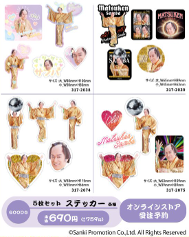 上様デザインのTシャツや、ミラーボールをあしらったアクリルキーホルダー、スマホや筆箱に貼りたいステッカーセットなど、マツケン様大好きな人にはたまらないラインナップ。