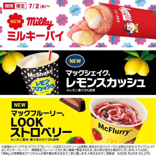 マクドナルド×不二家コラボ2025!ミルキーパイ・LOOKストロベリーフルーリー・レモンスカッシュ登場!