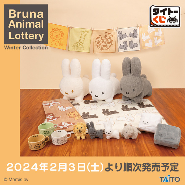 タイトーくじに「ブルーナアニマル Winter Collection」登場!2024年2月3日(土)より、ファミリーマートなどで取扱い。特大ぬいぐるみやブランケット、ポーチなどをラインナップ♪ミッフィー の作者ディック・ブルーナが描いた可愛い動物たちのグッズのくじです♡