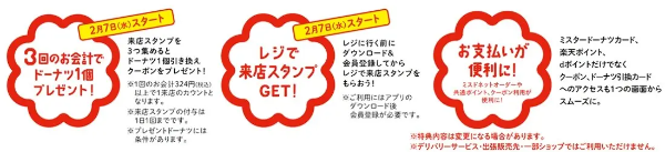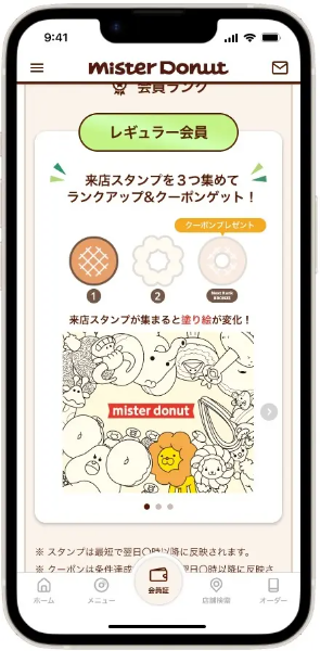 ミスタードーナツをより楽しめるように来店毎にスタンプを貯められる機能や、来店回数に応じた会員ランク制度を新たに導入。