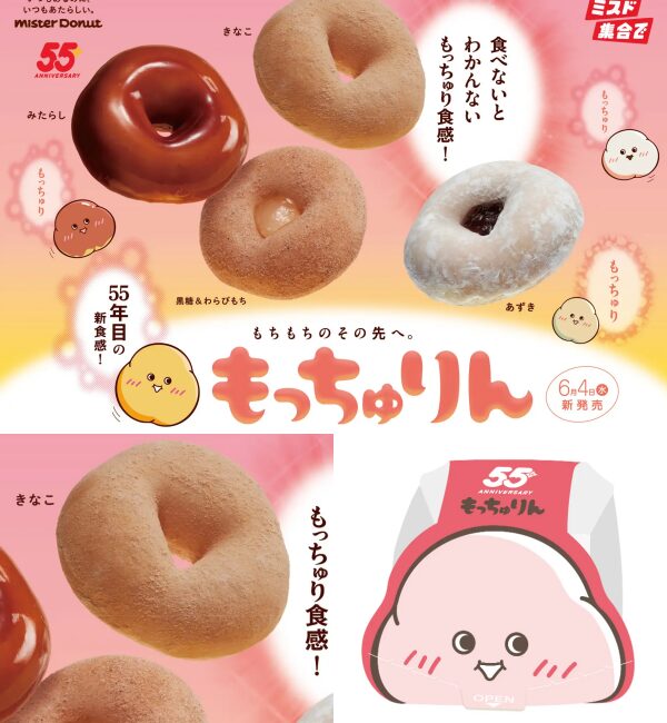 ミスタードーナツは、創業55周年を記念して“もっちゅり”とした新食感のドーナツ『もっちゅりん』を開発しました。国産のもち粉と米粉をブレンドした特製生地は、口に入れた瞬間の弾力とやわらかさが特徴。さらに、ドーナツ表面に独自開発のコーティングを施すことで、手に取ったときのふんわり感も楽しめます。味は全4種で、きなこ・みたらし・あずき・黒糖&わらびもちと、どれも和素材との絶妙な組み合わせ。新しい味わいと食感が融合した、特別感のある一品となっています。販売は全国のミスタードーナツ店舗にて(一部除く)、6月4日から7月中旬までの期間限定となっています。