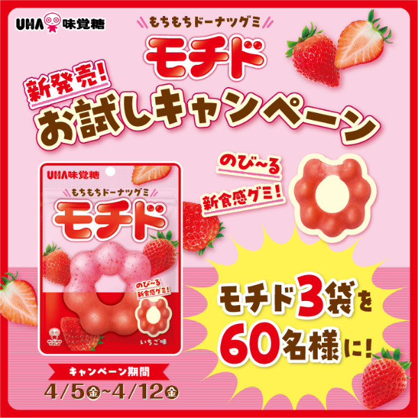 UHA味覚糖より、「モチド」いちご味が新発売♪モコモコとした形のリングドーナツを小さいグミで再現。もちもちのび〜る新食感のドーナツ型グミです♡そんな「モチド」の発売を記念して、Xにてお試しキャンペーンを開催。UHA味覚糖の公式Xをフォローして、対象のポストをリポストすると60名に「モチド」3袋が当たります♪