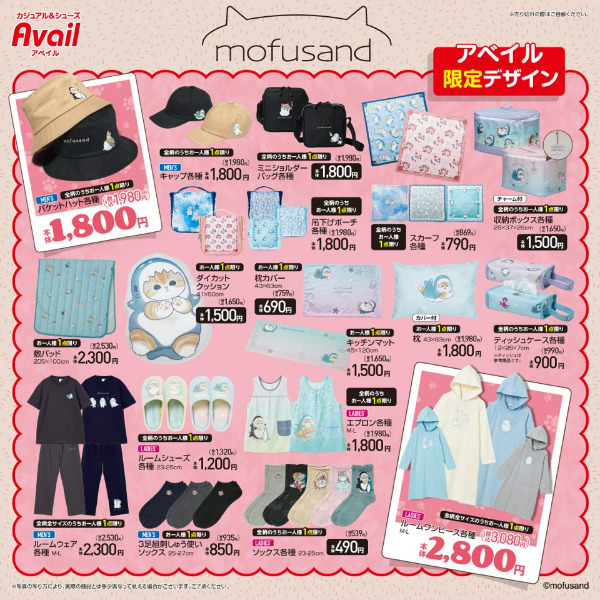 アベイルから、モフサンド(mofusand)とのコラボ商品が発売決定♪アベイル限定のデザインで、商品も多数!全国のAvail店舗、オンラインでも発売されるので、近くにお店のない方も、ネットから購入可能です!商品によって購入の数に制限がありますので、ご注意ください!