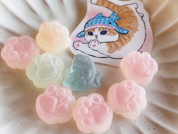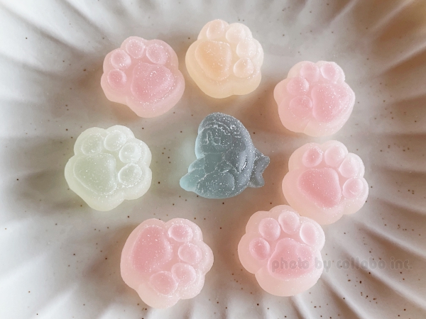 色とりどりの肉球グミ7個と、さめにゃんのグミが1個入っていました。グミは甘すぎずしっかりした歯ごたえでとっても美味しかったですよ。可愛いくて、しばらくぷにぷにしたり並べてみたり遊んでから頂きました。
