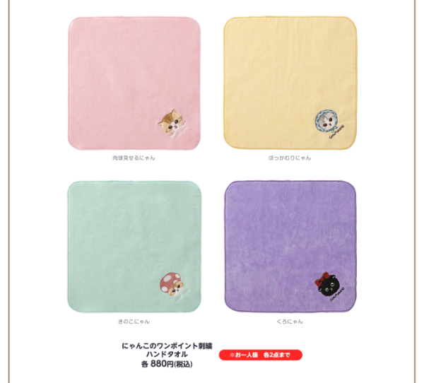 | にゃんこのワンポイント刺繍ハンドタオル | 880円 |