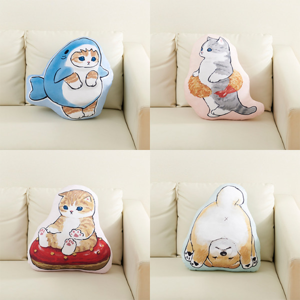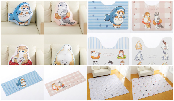 大注目のダイカットクッションは、さめにゃん、えびふらいにゃん、ドーナツにゃん、でんぐりがえりするキャンコの4種類展開。絵柄に沿った形状がころんとして、モフサンドの可愛さが際立ちますね。キッチンマットやトイレマットには足跡がデザインされたり、にゃんこたちのストーリーを想像して暮らしの中で楽しめるデザインとなっています。