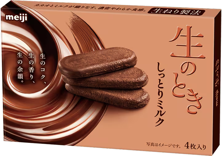 『生のときしっとりミルク』は、明治の独自技術「生ねり製法」によって生まれた、これまでにない新しい食感を持つスイーツです。口に入れた瞬間にやさしくほどけるやわらかさと、濃厚なカカオとミルクの風味が、まるで“時間(とき)”が止まったかのような余韻を演出します。一般的なチョコレートや生チョコとは異なる水分量を持ち、しっとり感と常温保存の利便性を両立。生クリームと香り高いカカオを贅沢に使用し、甘さと香りがバランスよく調和しています。チョコレートの定義を超えた新ジャンルの「菓子」として、ギフトにも自分へのご褒美にもぴったりの一品です。